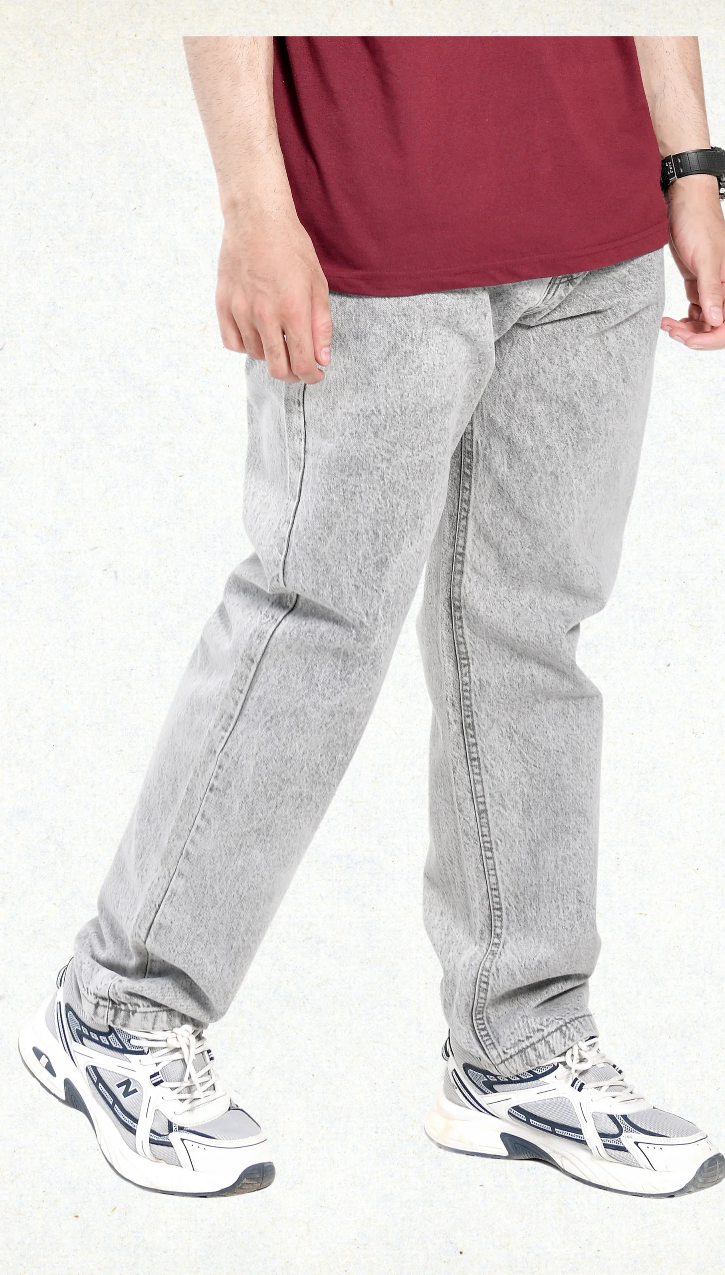Grey jeans are a stylish and trendy choice.